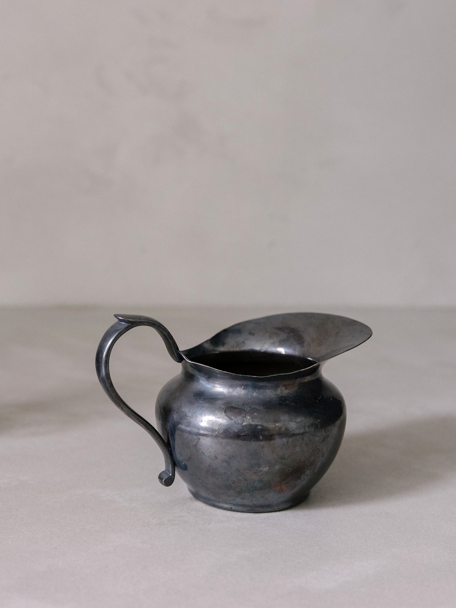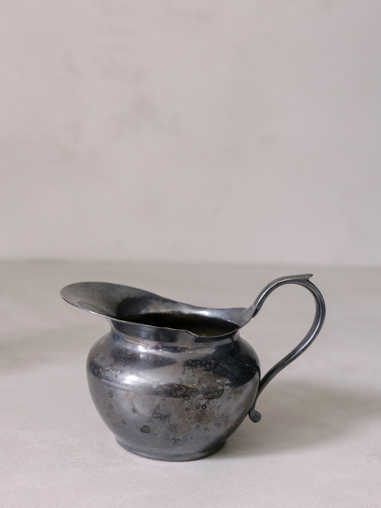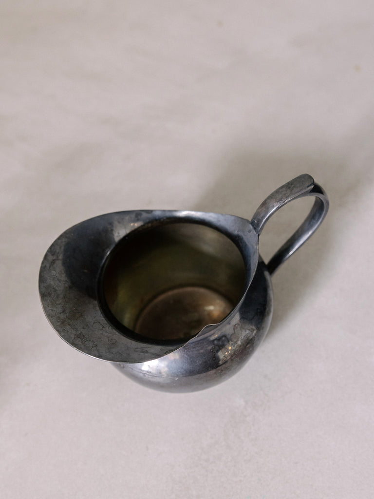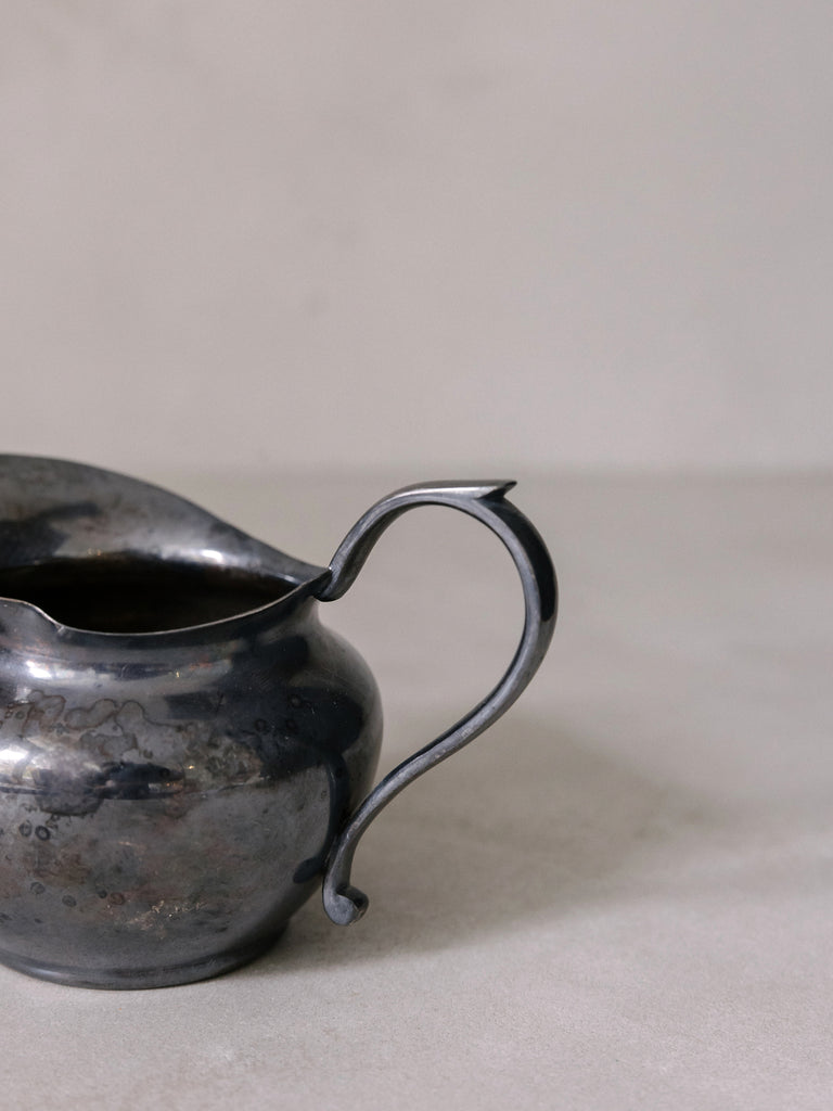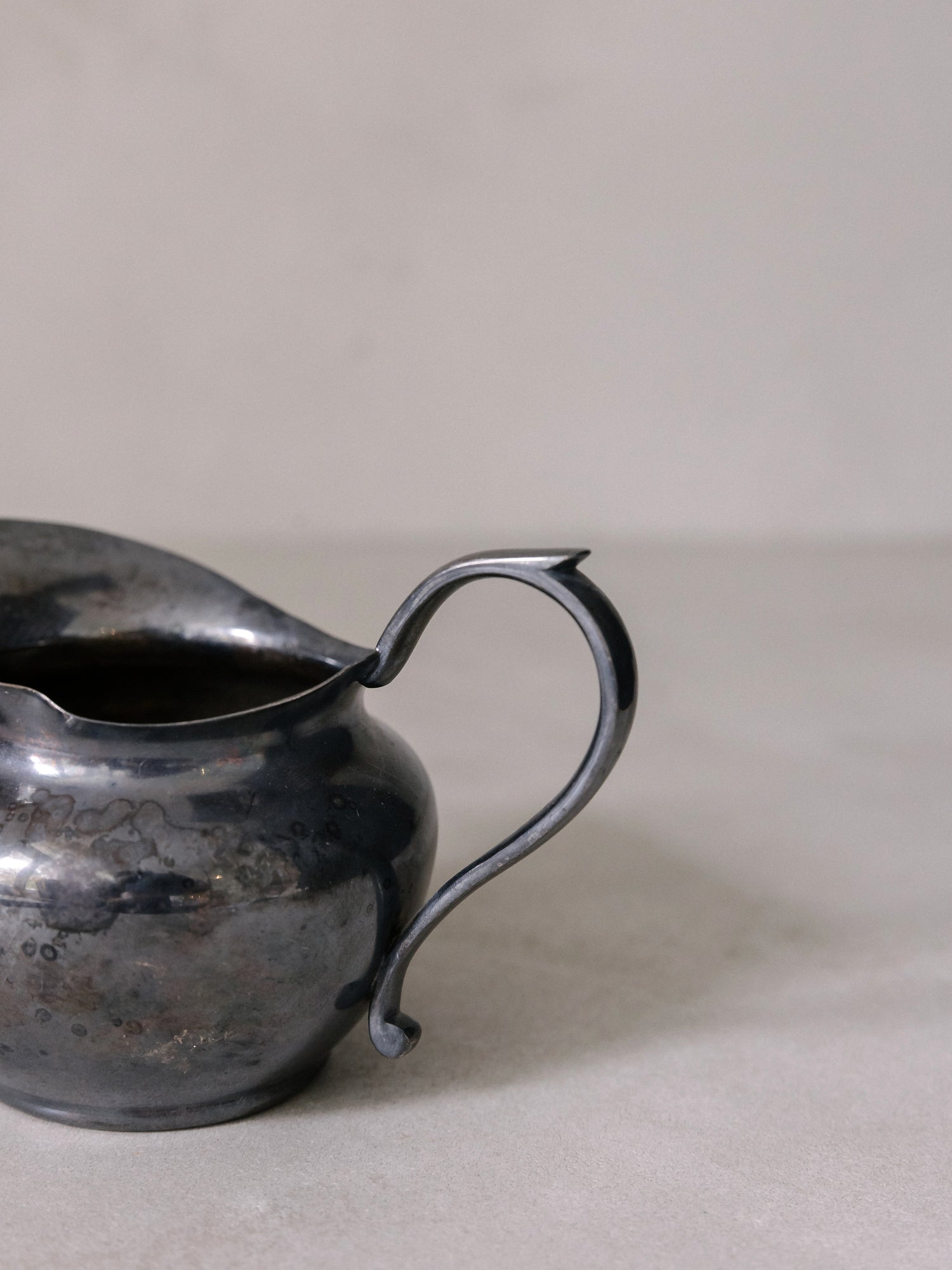 With its round-bellied shape and delicately curled handle, this old silver-plated creamer once sat beside sugar cubes and softly clinking teaspoons. Its darkened patina tells a story of many slow and meaningful mornings.